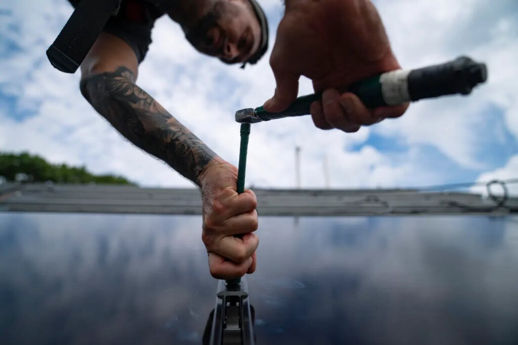 FILE – An employee of NY State Solar, a residential and commercial photovoltaic systems company. A new report has found that clean energy now provides more employment than the fossil fuel industry, reflecting the shift that efforts to tackle climate change are having on the global jobs market. (AP Photo/John Minchillo, File)