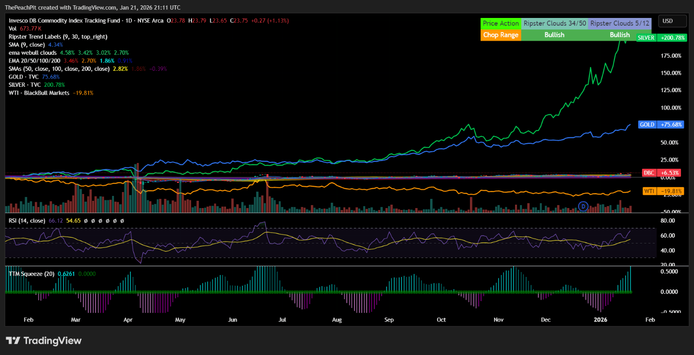 The Invesco DB Commodity Index Tracking Fund ETF (DBC) is a passively managed exchange-traded fund designed to provide investors with broad exposure across a basket of commodities, including industrial and precious metals like aluminum and silver, oil and gas, and agriculture and livestock. Investing in commodities may provide investors with differentiated returns with respect to the broader equities market and, under certain circumstances, act as a hedge strategy. Due to the speculative nature of commodities investments, an investment in DBC may not be appropriate for every investor.