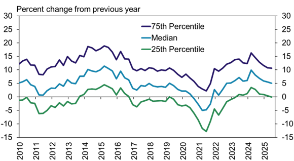 Disparities in the agricultural economy persisted through September with favorable conditions for livestock producers and weak profit opportunities in the crop sector. Strength in livestock industries, particularly cattle, has supported farm finances in some regions. Recent ad hoc government payments associated with the American Relief Act and resilient farm real estate values have also eased some stress in the sector. Looking ahead, however, low crops prices and elevated production expenses will likely continue weighing on farm finances and credit conditions in the coming months.