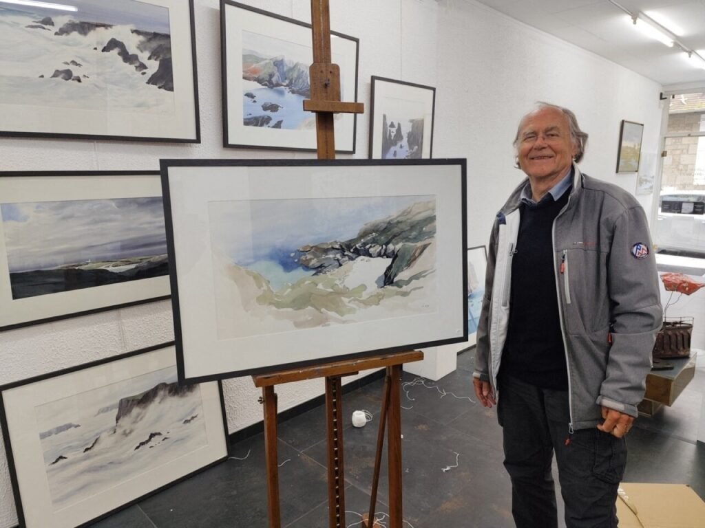« Aujourd’hui, retraité de l’architecture, je m’adonne totalement à ma passion de la peinture et notamment de l’aquarelle. Je travaille surtout au lavis, qui allie eau, pigment et papier. C’est très technique, car on n’a pas de repentir, ce qui pour l’art signifie : si on n’est pas content de notre travail, on ne peut pas le reprendre. Je travaille donc essentiellement sur grand format et avec un gros pinceau, pour donner beaucoup d’eau. Mais comme cela sèche très vite, si on n’est pas rapide, c’est raté » explique l’artiste qui puise son inspiration sur la mer et les voyages qu’il a réalisés « en commençant par Chausey et les îles anglo-normandes, le Mont Saint-Michel bien sûr, les îles de Groix et Belle-Ile en Bretagne, mais aussi la Patagonie, le Cap Horn, le Vietnam et la Grèce ».