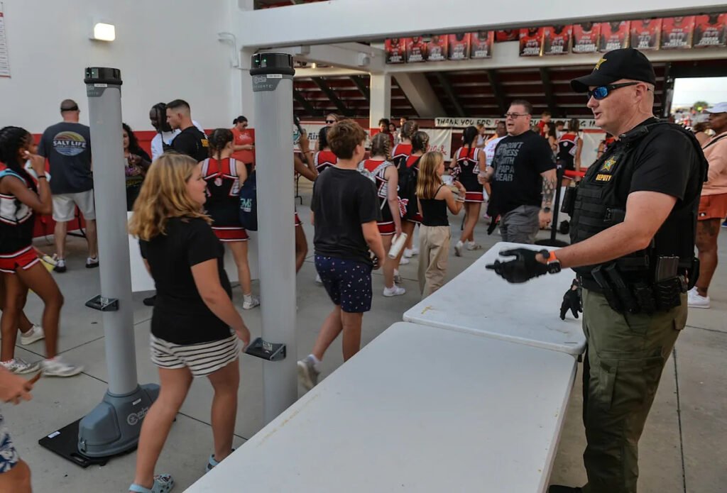 Indian River County Sheriff’s Office School Resource Deputy Robert Bonvie talks with students and parents arriving through a metal detector at the Citrus Bowl for Vero Beach High School’s home football game against Fort Pierce Central High School on Friday, Sept. 27, 2024. The deputies screen arriving students and parents at football games as a safety precaution.