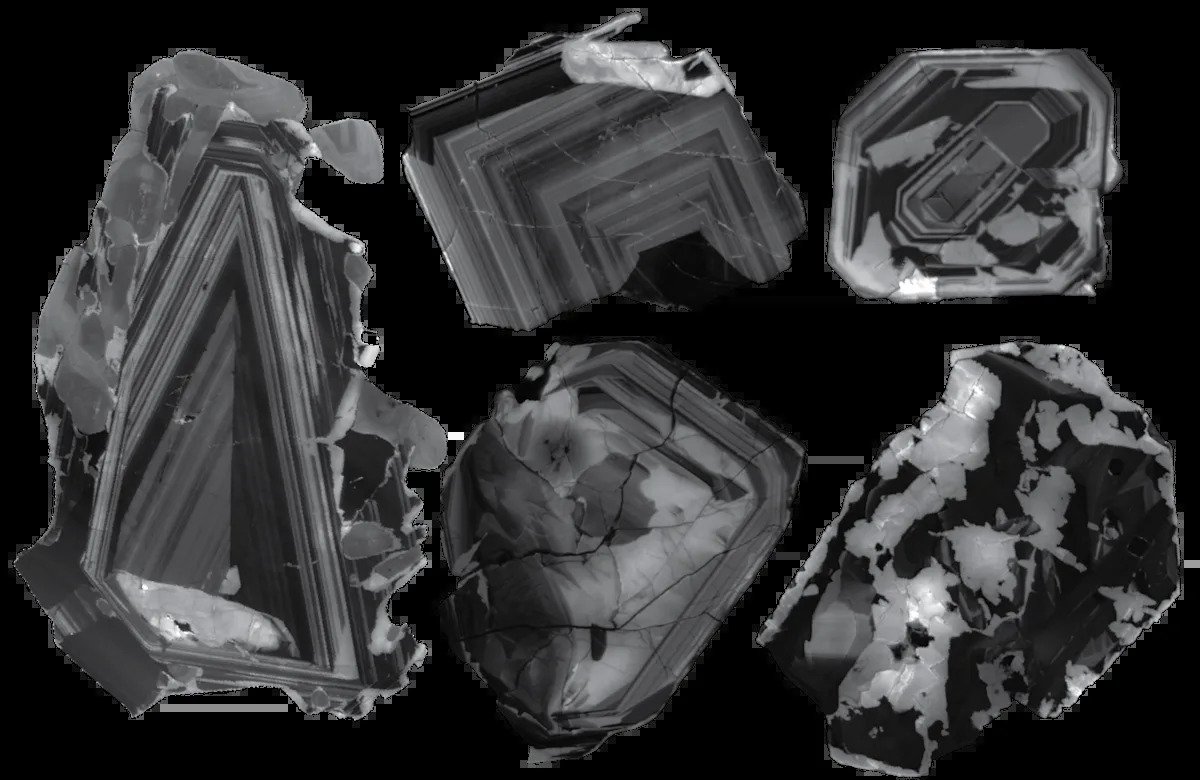 Zircon crystals ranging from 0.1 to 1 mm that were analyzed in this study. Their isotopic signatures allowed the scientists to determine the age of carbonatite formation with high precision. | Credit: Figure reproduced from: Droellner et al., (2025) Geological Magazine, Volume 162 , e33. https://doi.org/10.1017/S0016756825100204. © The Author(s), 2025. Published by Cambridge University Press. Licensed under CC BY