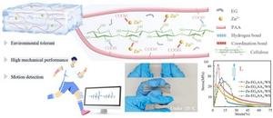 The resulting eutectogel integrates multiple reinforcing mechanisms. Poly(acrylic acid) chains form dense hydrogen bonds with cellulose nanofibers, while Zn²⁺ ions create coordination crosslinks with carboxylate groups, producing a physically and chemically entangled network. This synergistic structure leads to a tensile strength of up to 41.5 MPa and a toughness of 8.4 MJ m⁻³—values that exceed those of most reported conductive gels and rival some structural polymer composites.