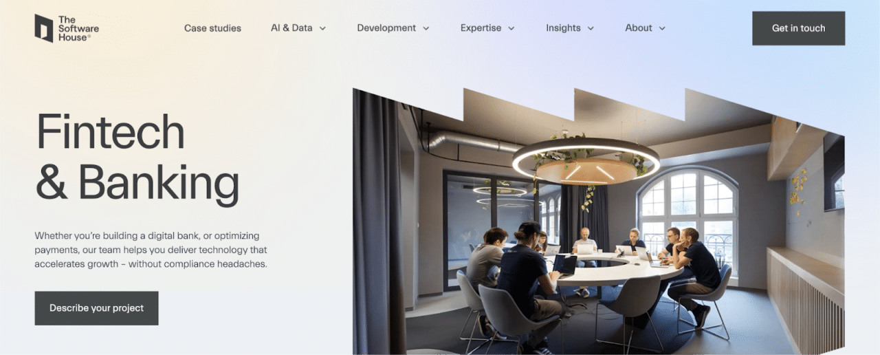 Core services include payment infrastructure (SEPA, SWIFT, multi-currency), regulatory compliance (PSD2, GDPR, KYC/AML), neobanking, BaaS platforms, and real-time transaction systems. The Software House specializes in payment rail modernization and AWS-based fintech architecture.