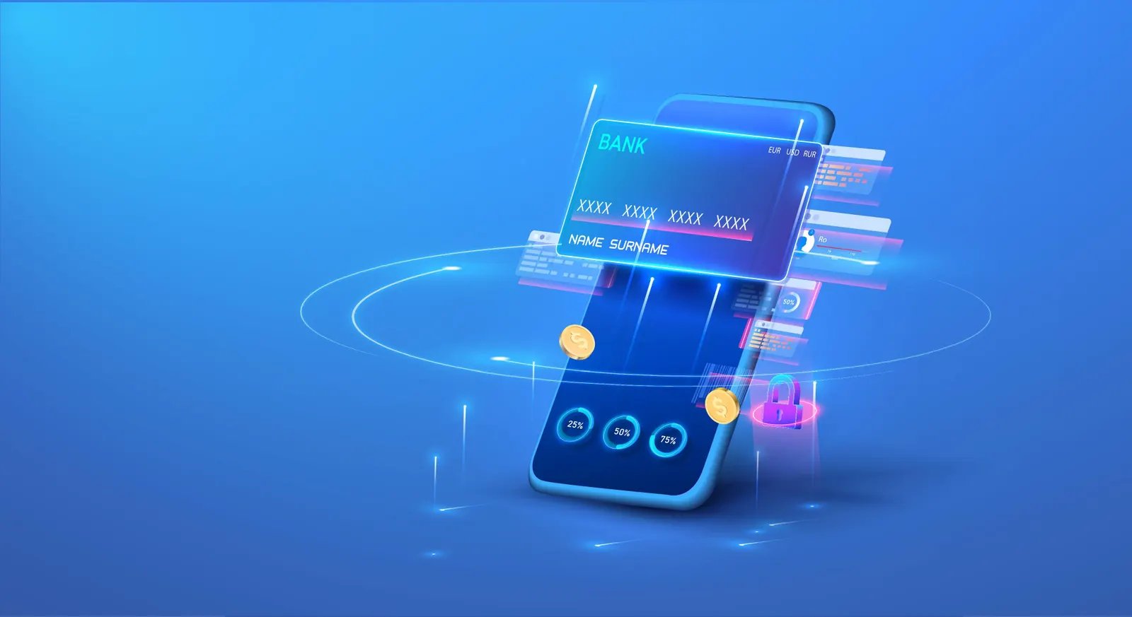 Futuristic Digital Banking Interface with Credit Cards and Secure Transactions. Online banking, login, protection, The concept of a smart wallet an application for payment by credit and debit card.