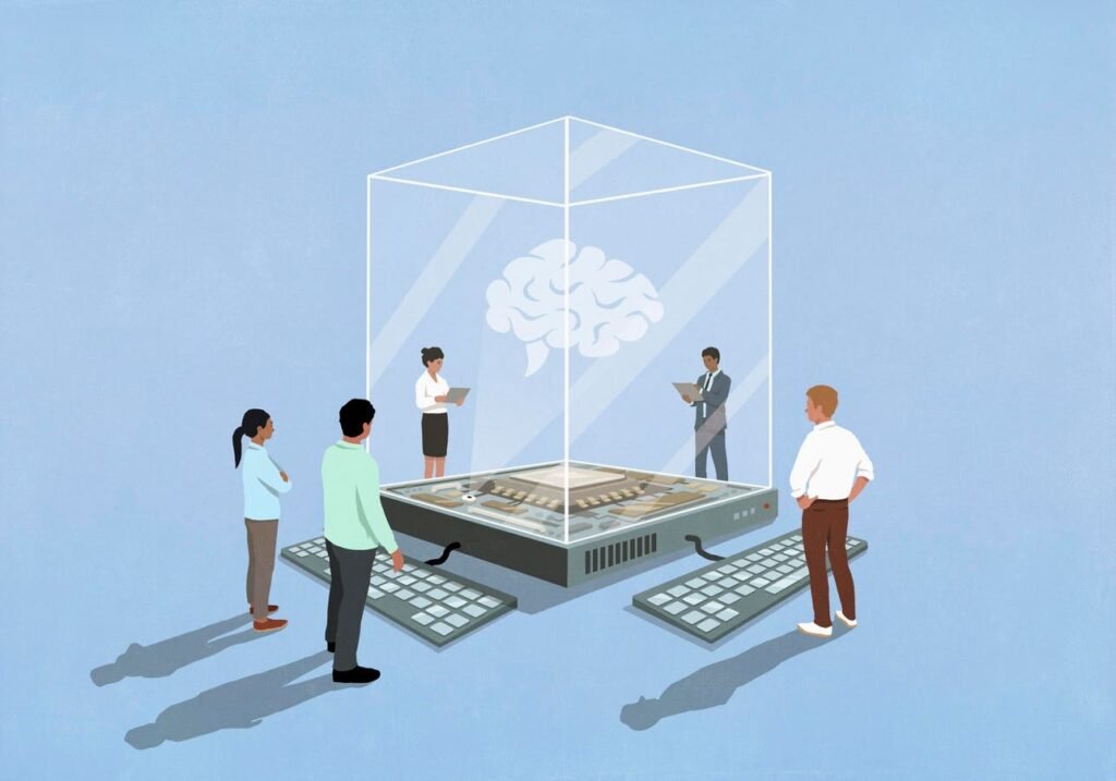 Illustration of multiple people in business clothing studying a cube structure with an "AI brain" inside. Two of the people are taking notes on laptops. Keyboards are attached to the cube. Businesses learning how to use AI concept.