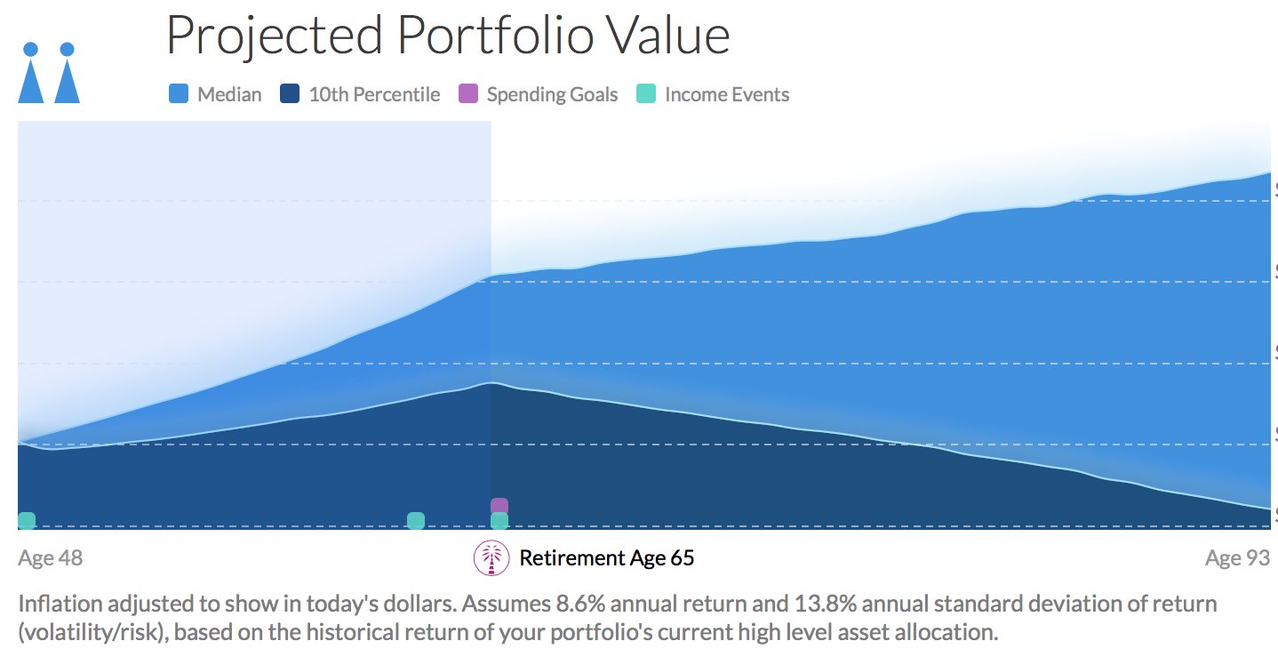For those that want to roll up their sleeves and spend hours with a retirement too, the Flexible Retirement Planner is the tool of choice. The tool allows for very detailed inputs. For example, you can set your taxable portfolio, tax deferred portfolio, and tax free portfolio (i.e., Roth accounts). You can even configure the Monte Carlo simulator’s sensitivity analysis and the asset allocation of your portfolio. The result is a graph of future retirement fund values and the probability of the success of your retirement portfolio.