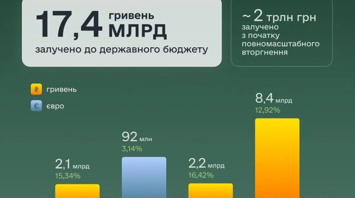 UAH 17.4 billion in equivalent were attracted to the state budget during auctions for the placement of government domestic loan bonds.