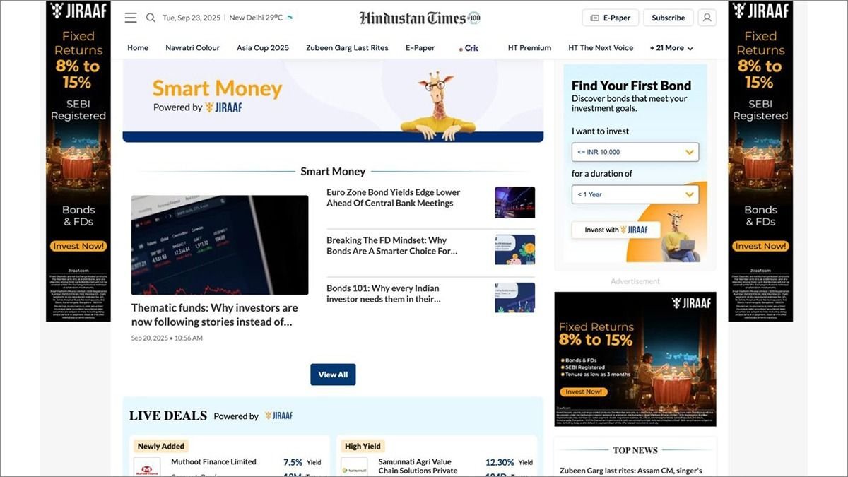 Responding to this shift, hindustantimes.com has partnered with Jiraaf, a SEBI-registered online bond platform, to launch a dedicated Bonds section under its Smart Money vertical. This editorially driven property will decode the fixed-income category for readers across India, equipping them with clear insights, tools, and resources to better understand and act on bond opportunities.