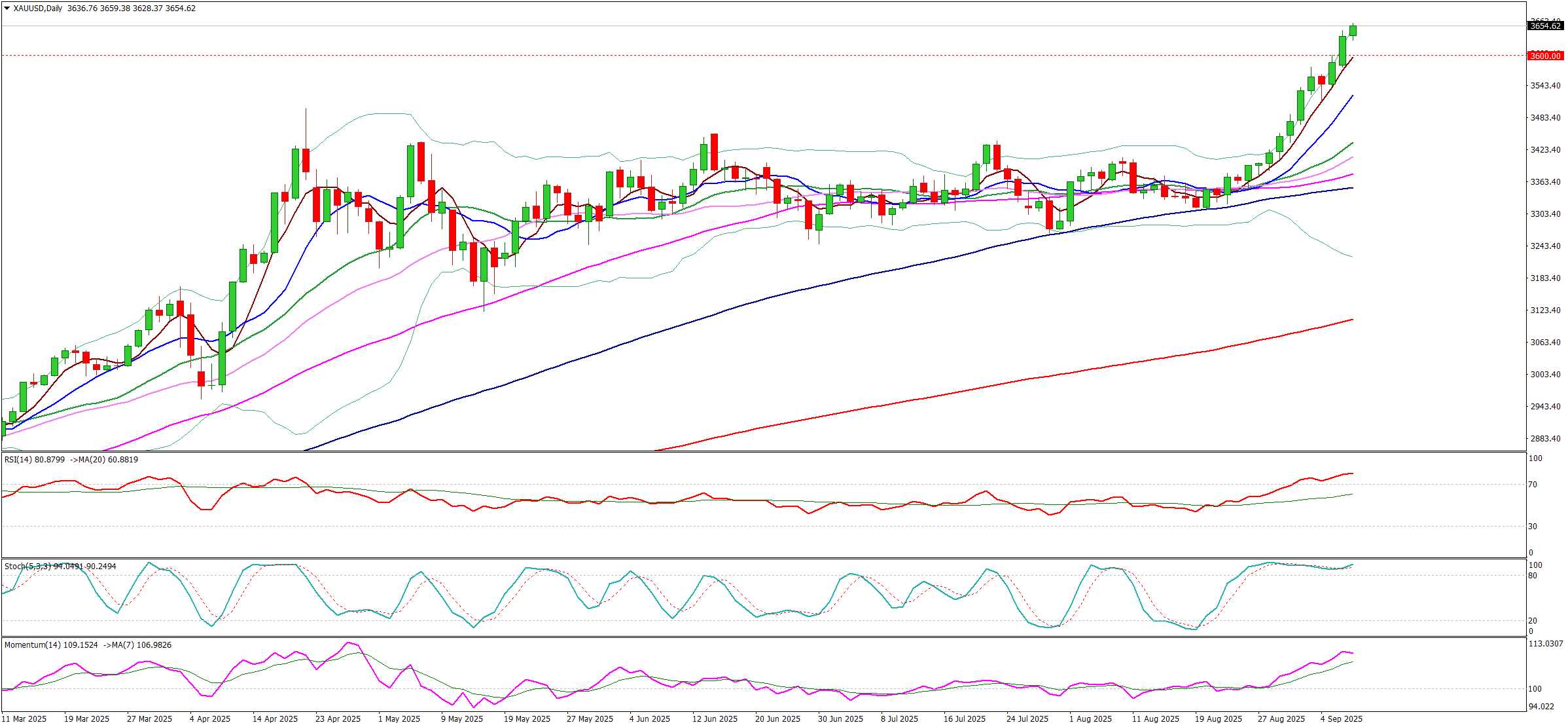 Gold rose to new record high ($3659) in early Tuesday’s trading, after strong acceleration on Monday (up 1.5%) which resulted in break and close above psychological $3600 barrier.