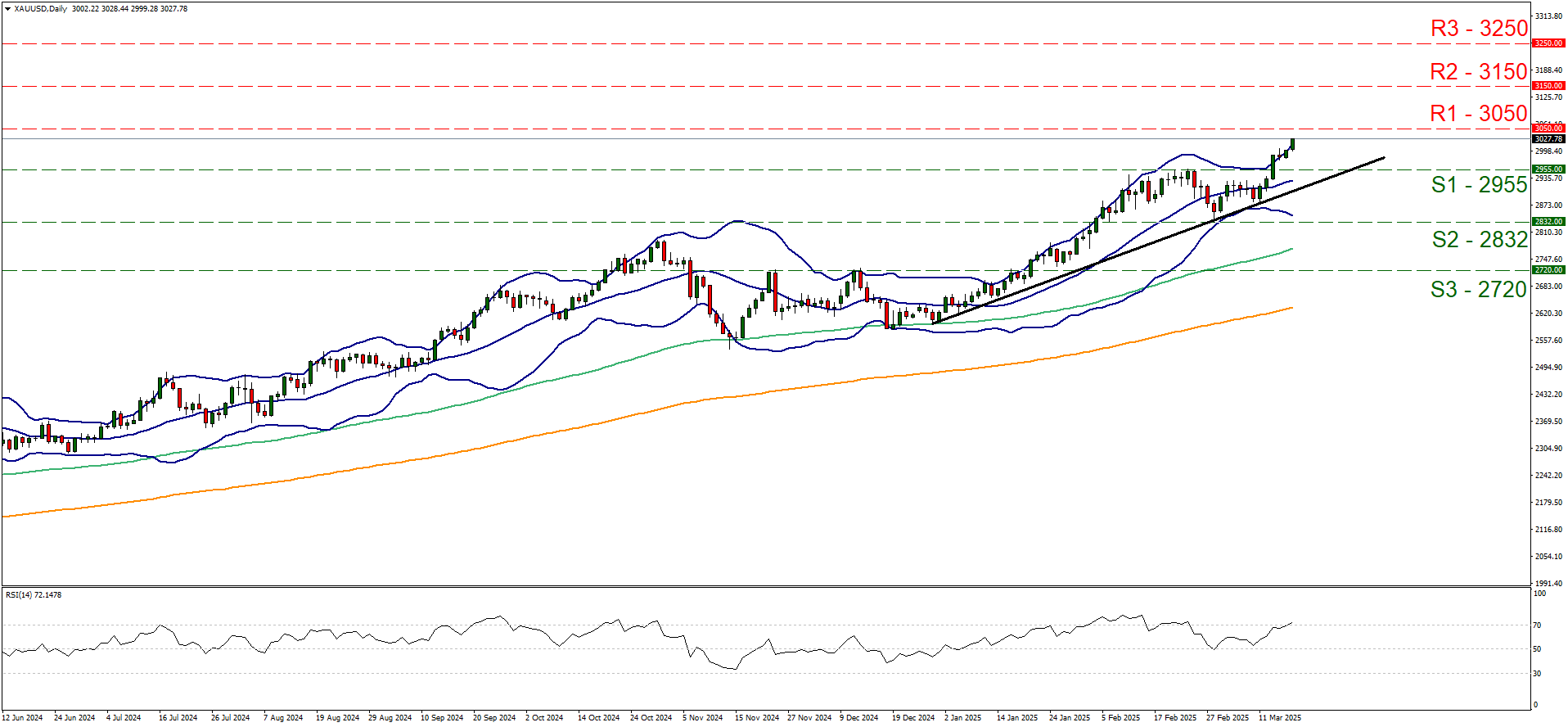 Ona technical level since our last report, Gold’s price was able to break the 2955 (S1) resistance line, now turned to support. Gold’s price has not formed new higher highs by surpassing $3000 per Troy ounce and reaching new record high levels. As the upper boundary of the precious metal’s sideways motion has been broken, we abandon our bias for a sideways direction and renew our bullish outlook. We shift the upward trendline guiding the gold’s price since the end of the past year to the right and intend to maintain our bullish outlook as long as it remains intact. We also note that the RSI indicator is currently testing the reading of 70 implying a strong bullish market sentiment for the shiny metal, yet at the same time may imply that gold’s price may have reached overbought levels and may be ripe for a correction lower. Also the price action has reached and even slightly breached above the upper Bollinger band in another signal of a possible correction lower or a possible slow-down of the bulls. Should the bulls maintain control over gold’s price as expected, we set as the next possible target for the bulls the 3050 (R1) resistance line. On the flip side, a bearish outlook seems currently remote and for its adoption we would require gold’s price to reverse direction, break the 2955 (S1) support line, continue to break the prementioned upward trendline, in a first signal that the upward movement has been interrupted and continue even lower to break the 2832 (S2) support level, paving the way for the 2720 (S3) support barrier.
