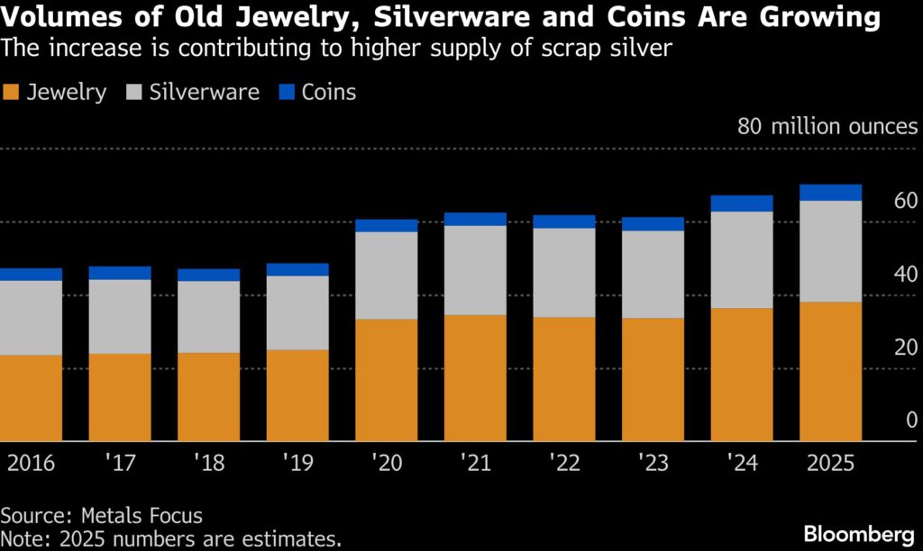 Recycled or scrap silver accounted for about 19% of total supply in 2025, and volumes from jewelry, silverware and coins have been significantly higher than analysts expected during the past year, Newman said. “We were surprised by it.”