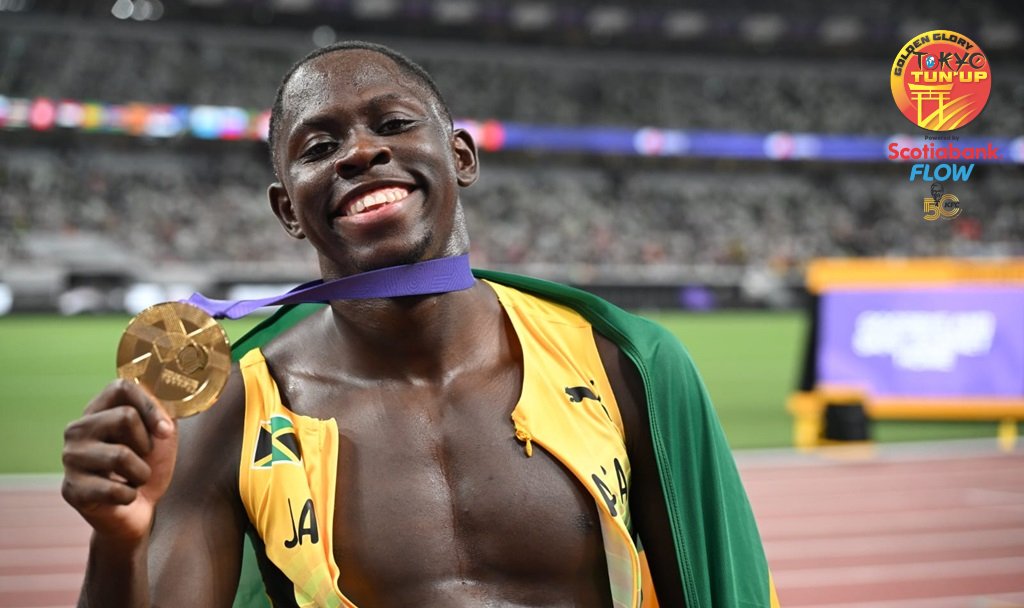 Oblique Seville of Jamaica celebrates after winning gold in the men’s 100m at the World Athletics Championships in Tokyo, Japan on Sunday, September 14, 2025. (Photo: Garfield Robinson)