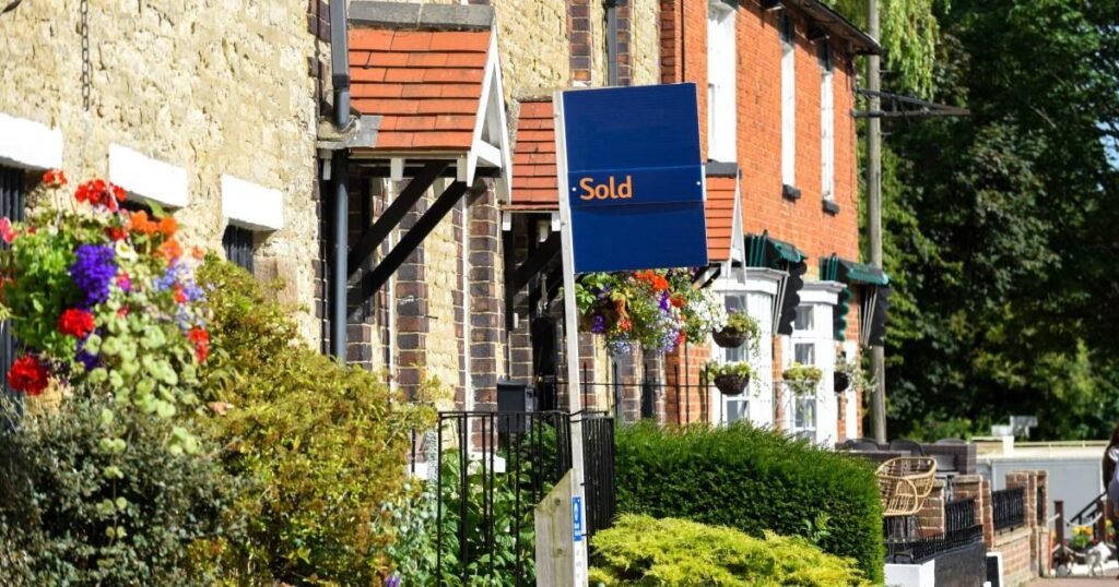 A row of terraced houses with a navy blue 'sold' sign in front.