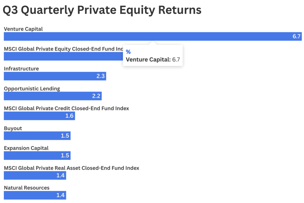 Overall, private equity funds had returns of 3.1 percent in the third quarter, down from 4.4 percent in the second quarter of 2025. Venture capital investments led the growth, performing the best in the third quarter with quarterly returns of 6.7 percent.