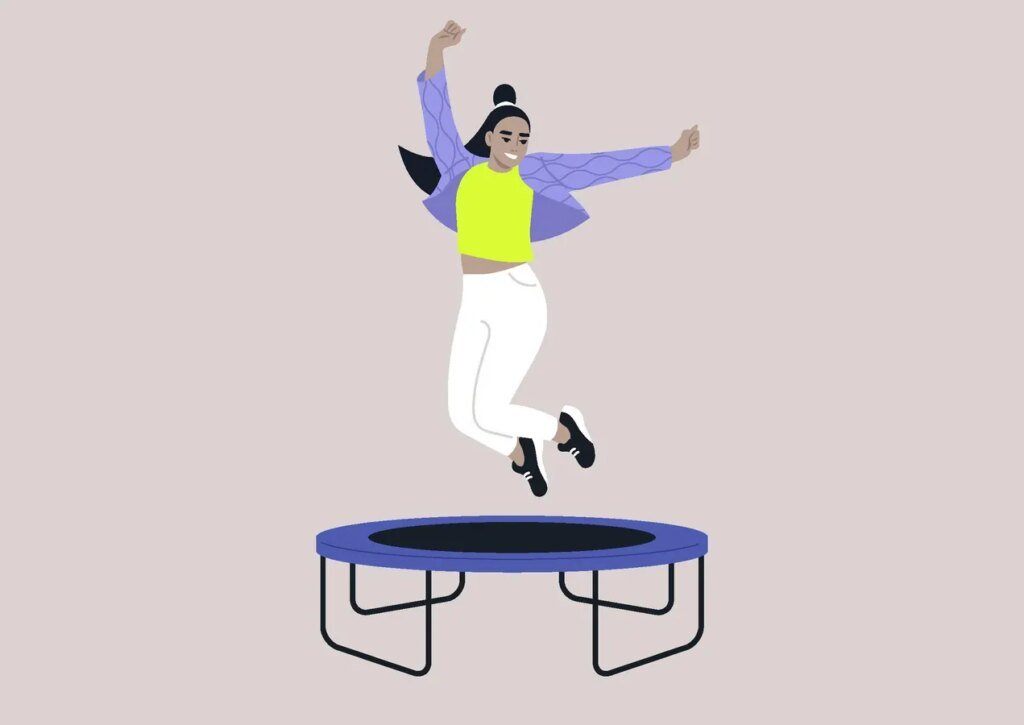 A joyful young woman in a quilted jacket adorned with wave patterns, jumping with her arms raised high above her head on a trampoline
