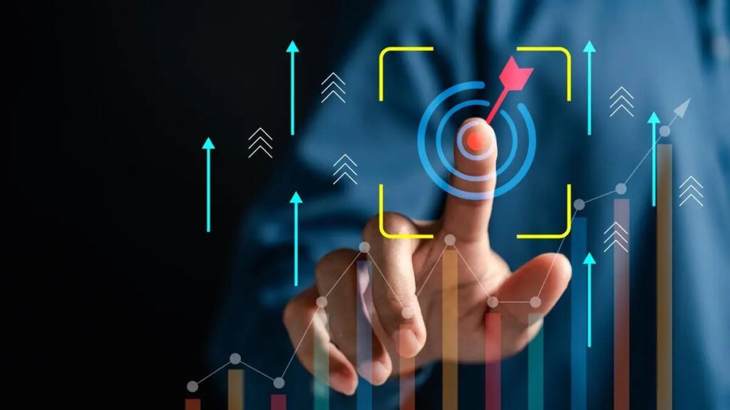 Businessman target chart icon with upward growth arrows. Concept of investment goal, success strategy, business performance, and financial planning in digital marketing. istock photo for BL